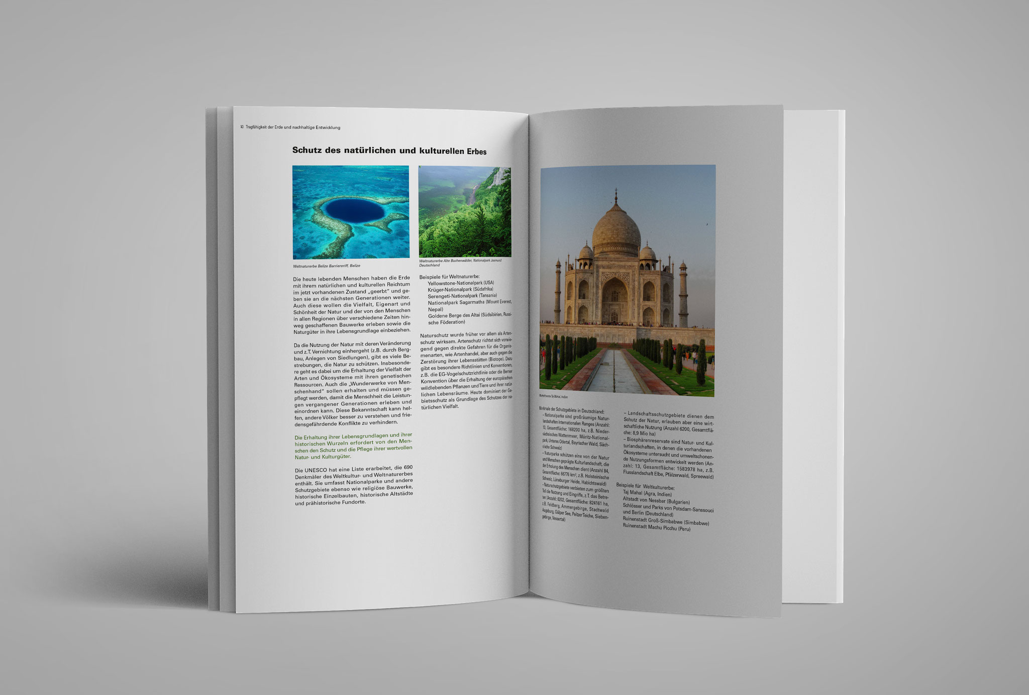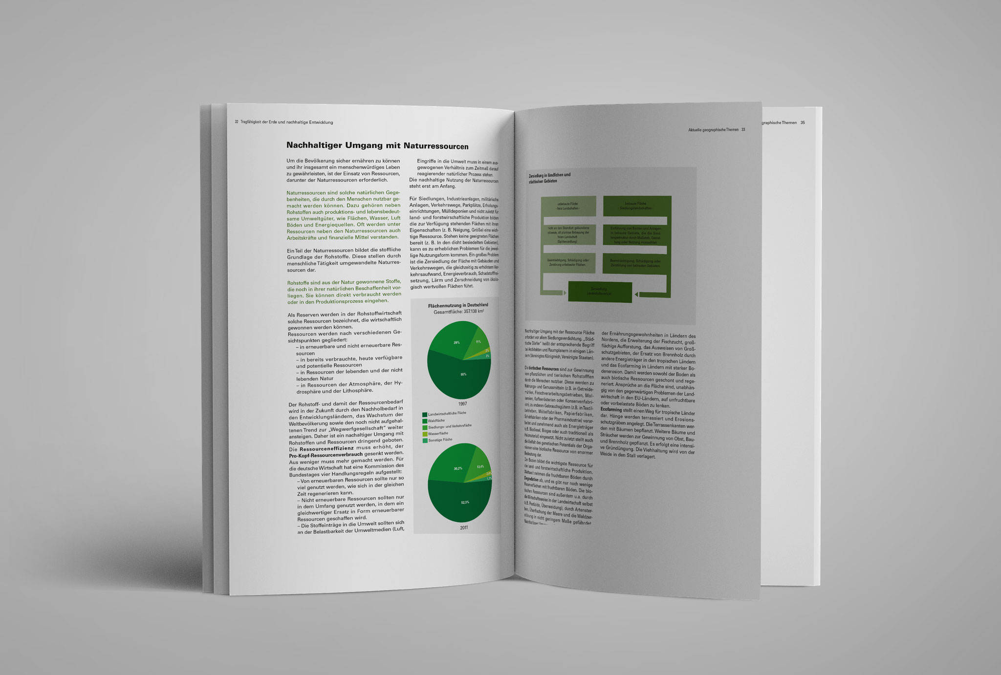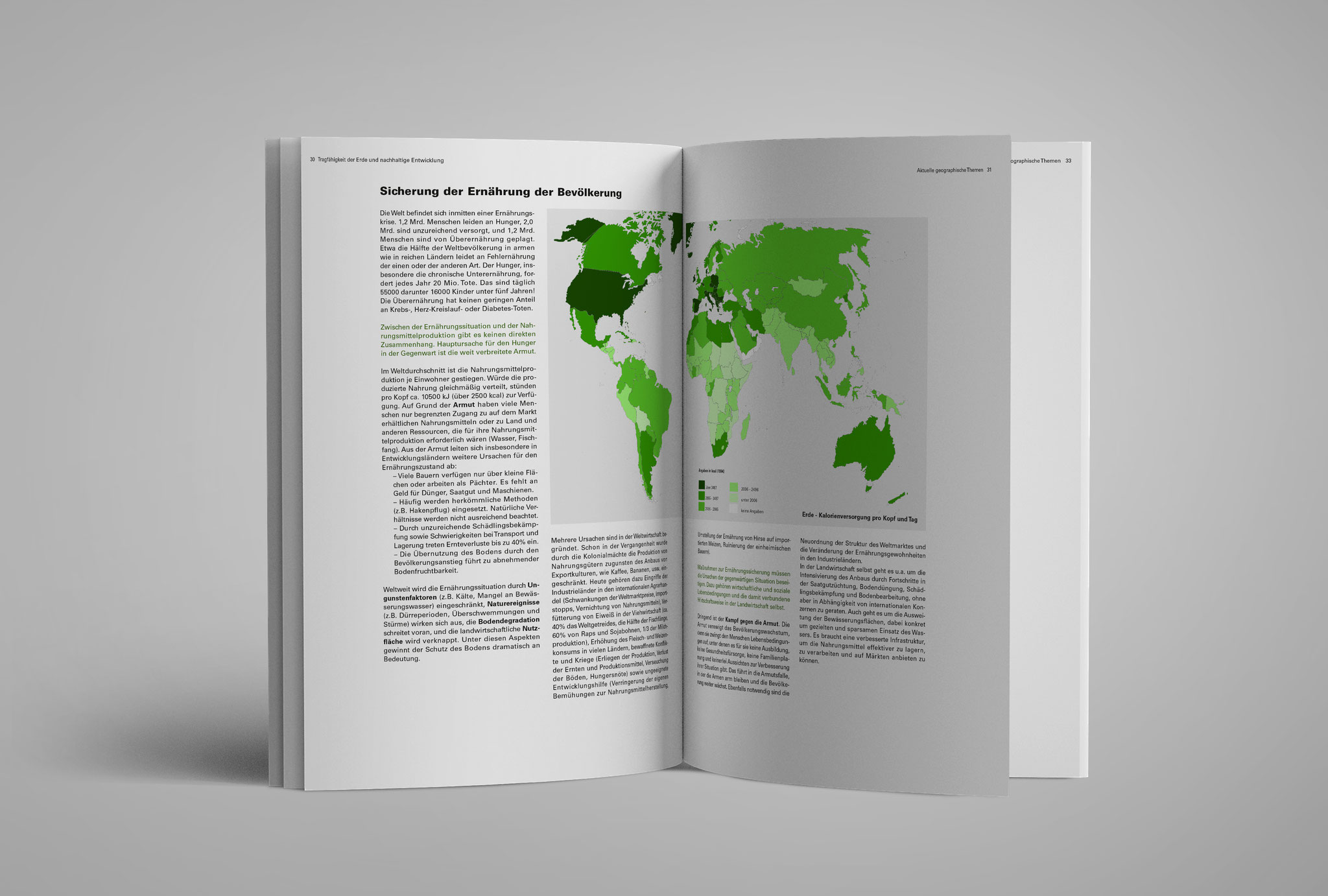 Im Zuge eines Studienprojekts, hatte ich die Chance einige Seiten eines alten Erdkundebuches neu zu gestalten. Jedes Oberthema innerhalb des Buches hat bei mir seine eigene Farbe erhalten, welche sich durch die Kapitel zog. In den Beispielbildern war es das Oberthema mit der Farbe Grün.
